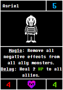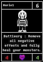 Asriel is a pretty good card with solid stats of 4/4 for a 5G monster and the ability to remove all negative effects from your other monsters, such as KR, Paralyze and Silence, making Asriel good against Perseverance and Patience. He will also restore 2 HP to those monsters as well as you yourself at the end of your turn, but only once, similar to the effect of Burgerpants. (This sort of effect has gained its own keyword in Beta 51.0: Delay.)