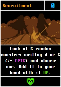 Ability: At the start of every 3 turns, add a Recruitment your hand. If you have 4 or less cards in your hand, add 2 Recruitments to your hand instead. If your hand is full, add draft to your deck.[]