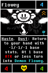 Flowey is a fairly normal card for its price, whose main ability is revival. When he dies, he will be placed back into your hand with 1 less base stat on all stats. Once he reaches 1 or less base ATK, he turns into Demon Flowey (which is a separate and collectible EPIC card). This makes him a great card to keep your deck from running dry while doing a soft board wipe against squishier enemies.