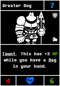 As mentioned before, you need Dogs to make its Aura work, and will be outclassed by Gyftrot and Coffee Man otherwise. Since Beta 49.0, Greater Dog is also the only Dog support card with Taunt, making a Dog deck quite vulnerable to an Aggro deck. You can counter this with the use of Snow Poff to summon more Greater Dogs and a fellow Dog Doggo to bring a hurt Greater back to your hand and replay it fully healed.