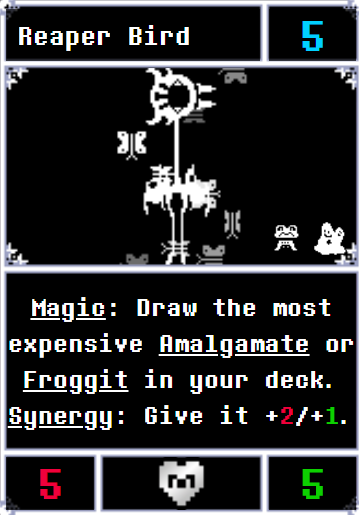 Reaper Bird is a decent mid-game Amalgamate and Frog that lets you draw another Amalgamate or Frog (unless if your deck is empty, then you will take fatigue damage as usual). Its Synergy allows the drawn card to gain +2/+1.